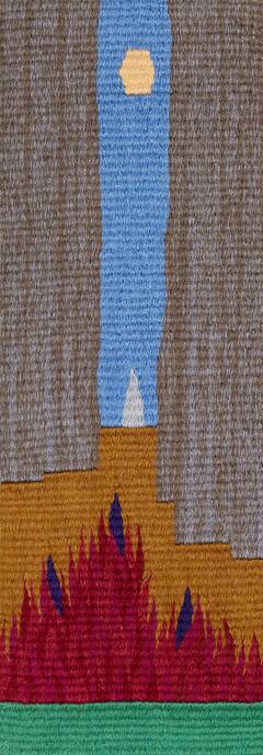 “In his anger over our creating a false god, Moses broke the first set of tablets, woven here as grey shards. He destroyed the golden calf, and it disappeared as dust in a stream. At this historic low point God could have given up on us and searched for another covenant-willing tribe, and we could have lost it all. Instead, God declared His Thirteen Attributes of Mercy, here woven in t’khelet. On both sides of the tapestry are grey-colored hints of the second set of tablets that Moses brought down from the mountain top. I chose to weave, in a rather quiet-looking tapestry, these four consecutive events as if they took place at once, suggesting a powerful connection between these four emotional and historically consequential episodes.”