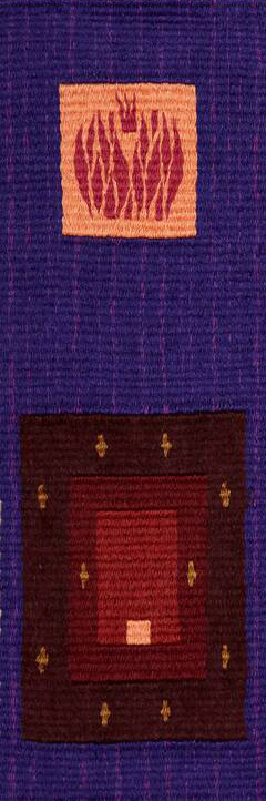 In the 9th tapestry, Berit weaves God’s instruction to the people to build a tabernacle – “so that I may dwell among You.” We see vivid rectangles within rectangles, showing the separated chambers of the tabernacle (in Hebrew kadosh, holiness is also translated as separateness), all the way to a small orange square, the Holy of Holies woven into a bright orange. The fire of revelation is there safeguarded and vitalized, ready to pour into the hearts of the Jewish people.